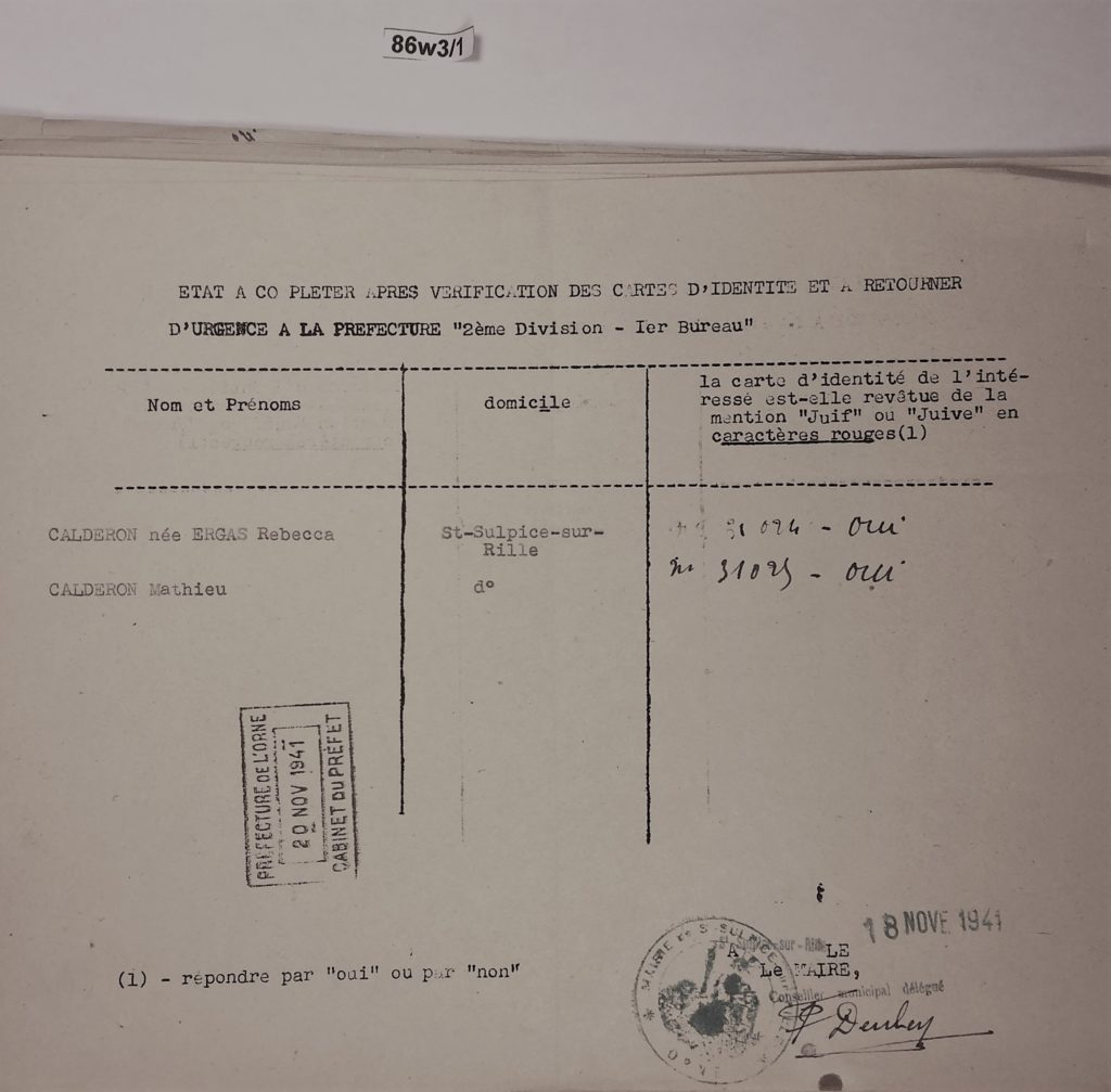 Brouillon préfectoral, Arch. dép. Orne, 86 W 5Régistre préfectoral Octobre 1940, Arch. dép. Orne, 86 W 3Acte de naissance Robert, 26 juin 1915, Etat civilActe de mariage, 6 Décembre 1928, Etat CivilActe de décès Robert, 10 Septembre 1931, Etat civilSt Sulpice sur Risle, Cadastre parcellaire section H, Arch. dép. Orne en ligne http://archives.orne.fr/consultez/consultez2.htmlAttestation Mathieu, propriétaire maison, 26 novembre 1940, Arch. dép. Orne, Préfet Orne, Enquête professionnelle, 14 Août 1941, Arch. dép. Orne, 86 W 3 Rapport commissariat Police l’Aigle, 18 Août 1941, Arch. dép. Orne, 86 W 3Vérification carte d’identité, 18 Novembre 1941, Arch. dép. Orne, 86 W 3Ordonnance allemande 28 mai 1942, Insigne spécial, 5 juin 1942, Arch. dép. Orne, 86 W 6Liste porteurs d’étoiles, Juillet 1942, Arch. dép. Orne, 86 W 6 Liste porteurs d’étoiles, Juillet 1942, Arch. dép. Orne, 86 W 6 Liste porteurs d’étoiles, Juillet 1942, Arch. dép. Orne, 86 W 6 Liste porteurs d’étoiles, Juillet 1942, Arch. dép. Orne, 86 W 6 Enquête logement, 18 Décembre 1942, Arch. dép. Orne, Enquête logement, 18 Décembre 1942, Arch. dép. Orne, Enquête logement, 18 Décembre 1942, Arch. dép. Orne, « Evacuation », Novembre 1943, Arch.dép. Orne,« Evacuation », Novembre 1943, Arch. dép. Orne,Liste des « évacués » du 24 novembre 1943, Arch. dép. Orne, Liste des « évacués » du 24 novembre 1943, Arch. dép. Orne,Rapport contrôleur départemental réfugiés, 30 novembre 1943, Arch. dép. Orne, Château de Grignon UGIF 75, Arch. dép. Seine Maritime, 40 W 112, 40 W 113Lettre maire St Sulpice, 2 Novembre 1944, Arch. dép. Orne, 86 W 5